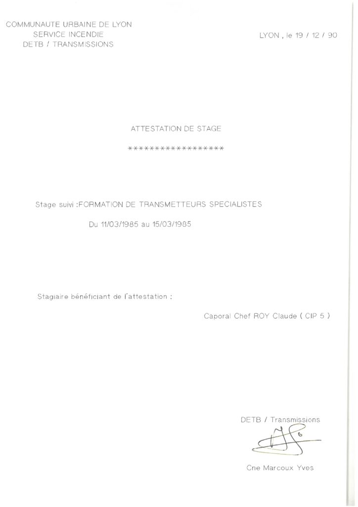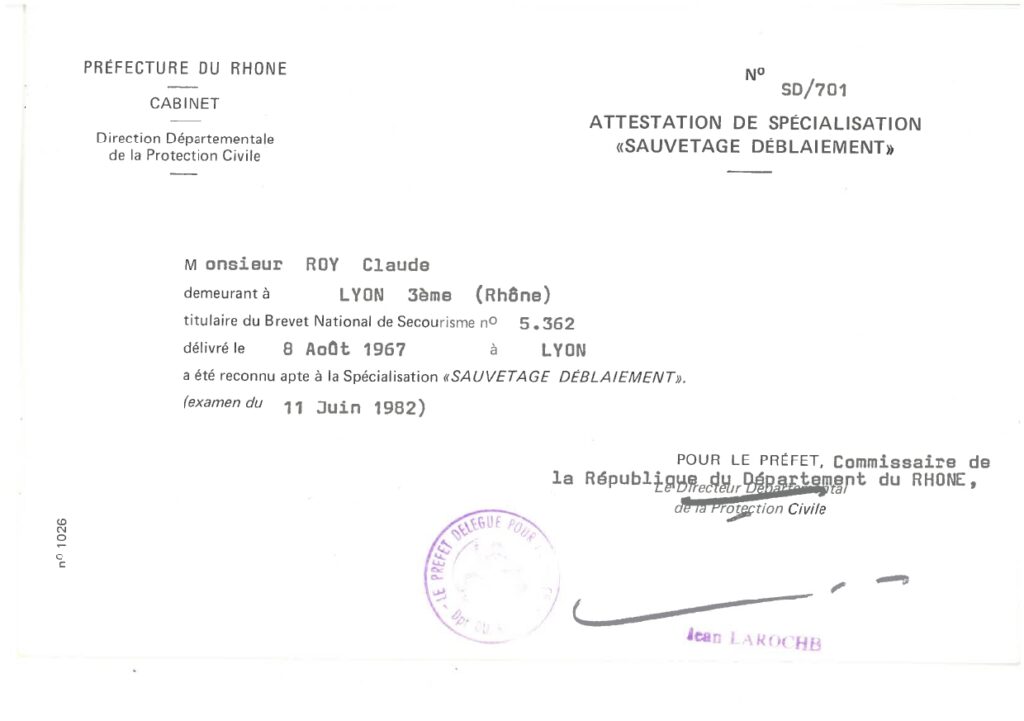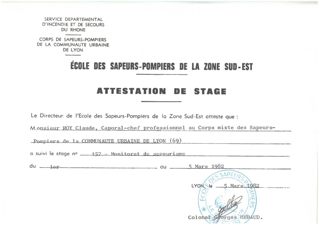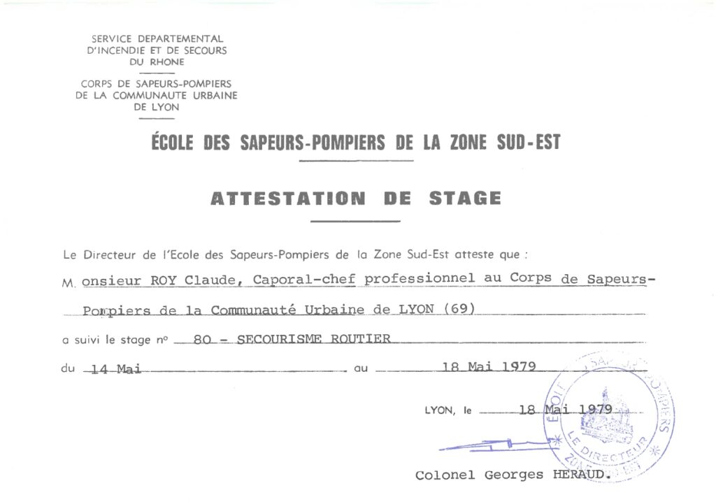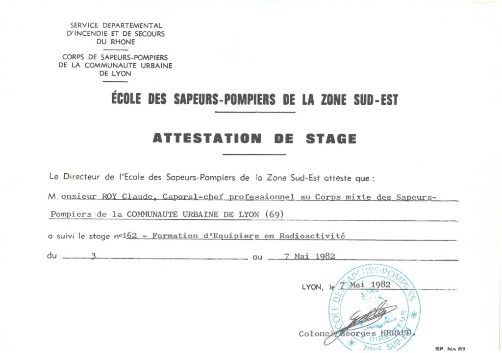 Très vite, Claude Roy se forme. Et ses archives en conservent quelques traces : secourisme routier (1979), sauvetage-déblaiement (1982), risques radioactifs, puis moniteur de secourisme et transmetteur spécialiste. On devine un pompier curieux, qui ne se contente pas d’assurer ses gardes mais qui va chercher toutes les compétences disponibles.