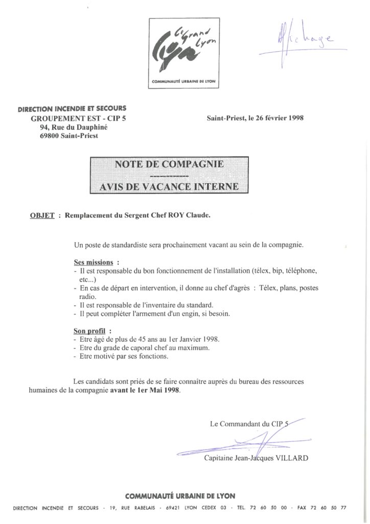 En fin de carrière, Claude Roy glisse progressivement du terrain vers les coulisses du dispositif. Un avis de vacance daté de 1998 décrit les missions du poste qu’il occupe alors au CIP 5 de Saint-Priest : standardiste, gestion des liaisons télex, bips et téléphones, remise des plans et postes radio aux chefs d’agrès, inventaire du standard. On le retrouve aussi désigné dans la composition d’un « conseil des sages » mis en place pour examiner les dossiers de sapeurs-pompiers décédés en service.
