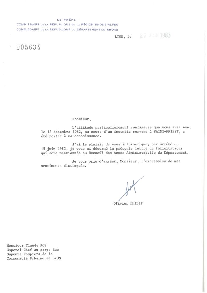 Une lettre du Préfet du Rhône, datée du 27 juin 1983, le félicite personnellement pour son attitude « particulièrement courageuse » lors d’un incendie survenu à Saint-Priest le 13 décembre 1982. La décision est publiée au recueil des actes administratifs : sa conduite exemplaire est formellement reconnue.