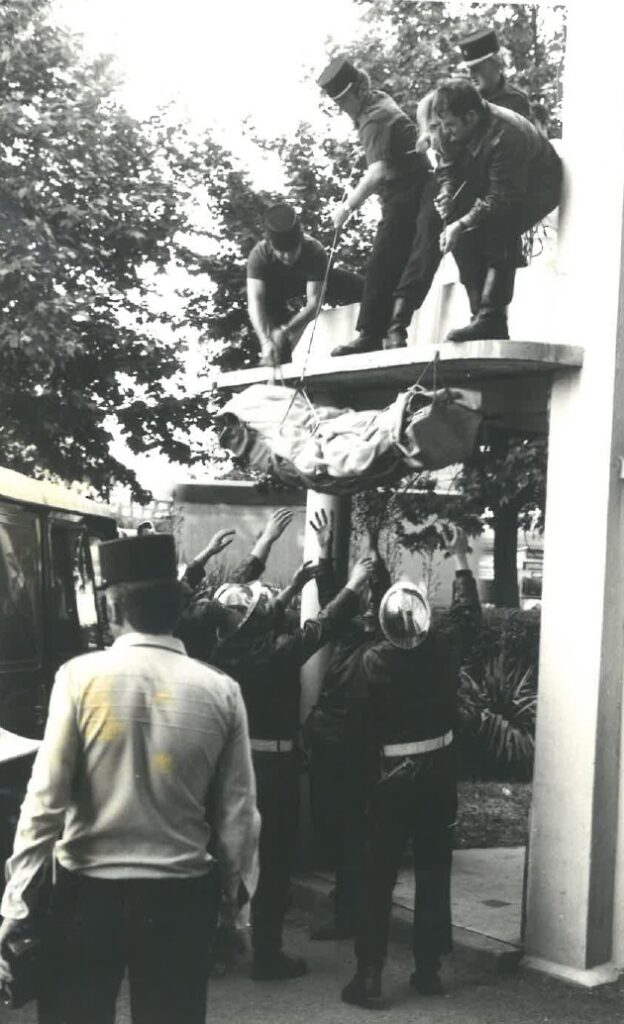 Puis vient l’intervention du 4 décembre 1968 aux entrepôts frigorifiques de la rue Seguin. Fuite massive de gaz ammoniac, sous-sol envahi, visibilité nulle, plusieurs ouvriers prisonniers, sauveteurs équipés d’appareils respiratoires qui descendent par rotations. Deux victimes décèdent, plusieurs personnes sont brûlées et intoxiquées, des pompiers eux-mêmes sont blessés.